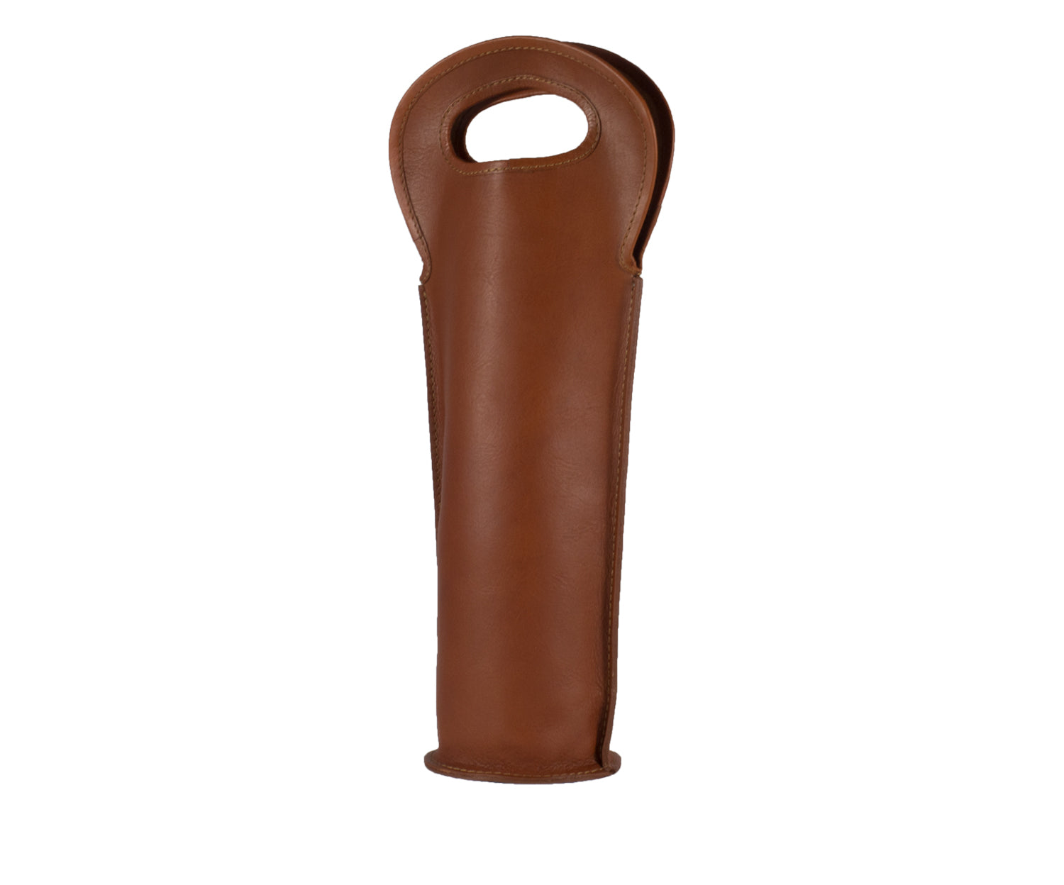 Full-grain leather case holds most standard sized wine bottles. The case is crafted with a handle for easy carrying.