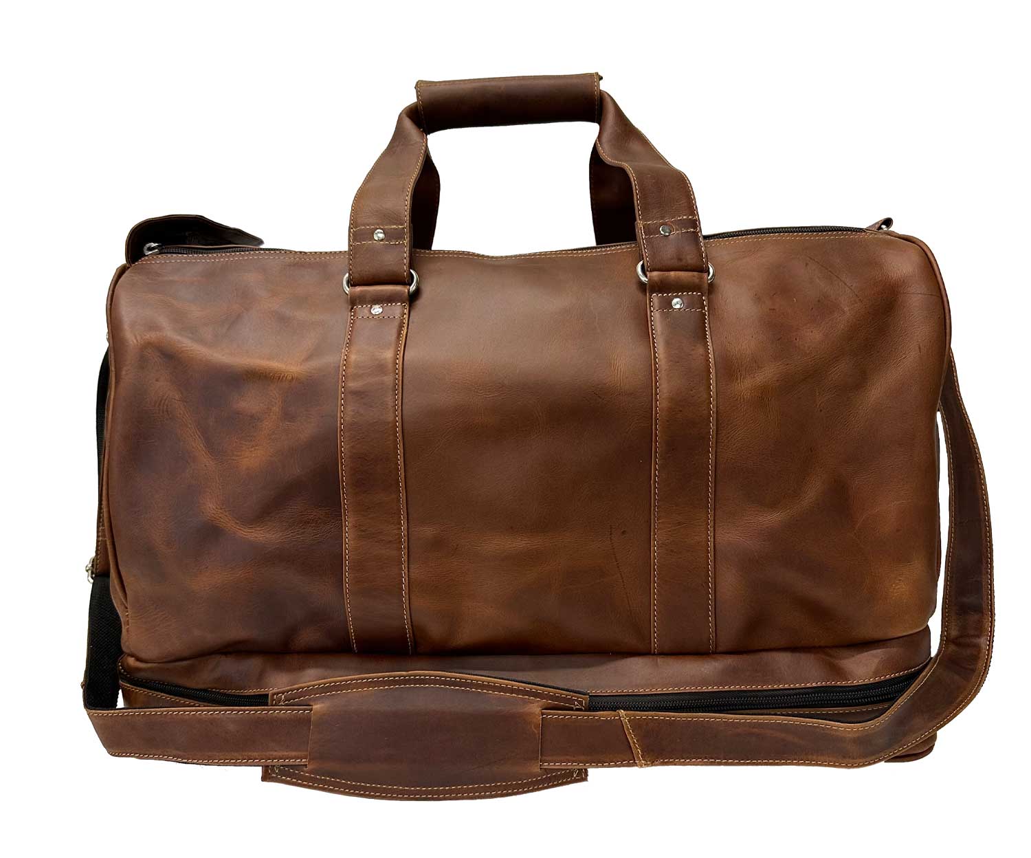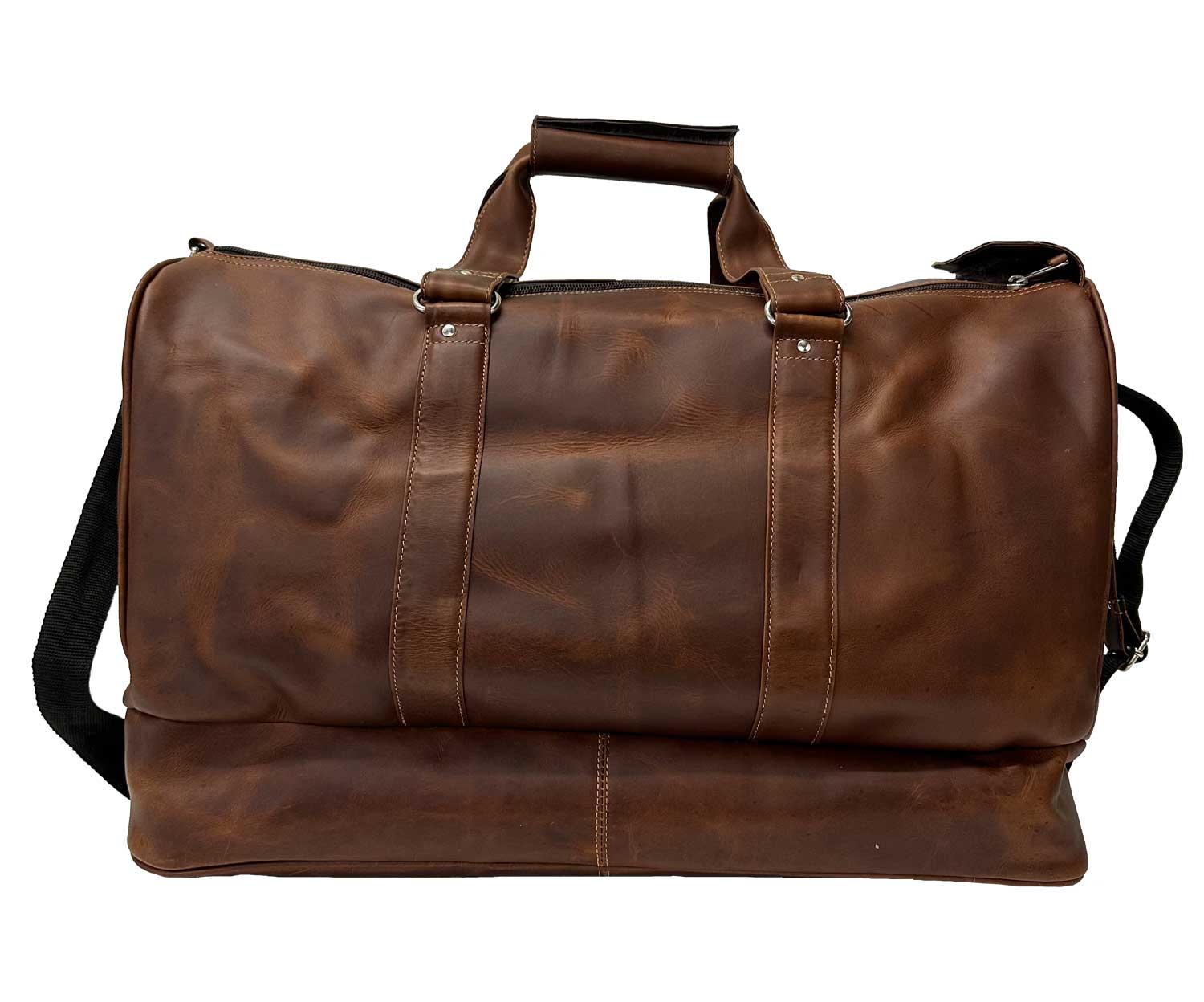 This Hampton leather duffle is perfect for stylish and convenient travel. Its oversized upper portion and double zipper leather tongue make accessing belongings easy. The bottom zipper compartment separates shoes and/or soiled clothes from clean clothes. An interior zipper pocket safely stores small items. An adjustable leather shoulder strap makes it comfortable to carry. Although slightly larger than most carry-on dimensions, it's still manageable. It's a practical and stylish investment built to last for many adventures.