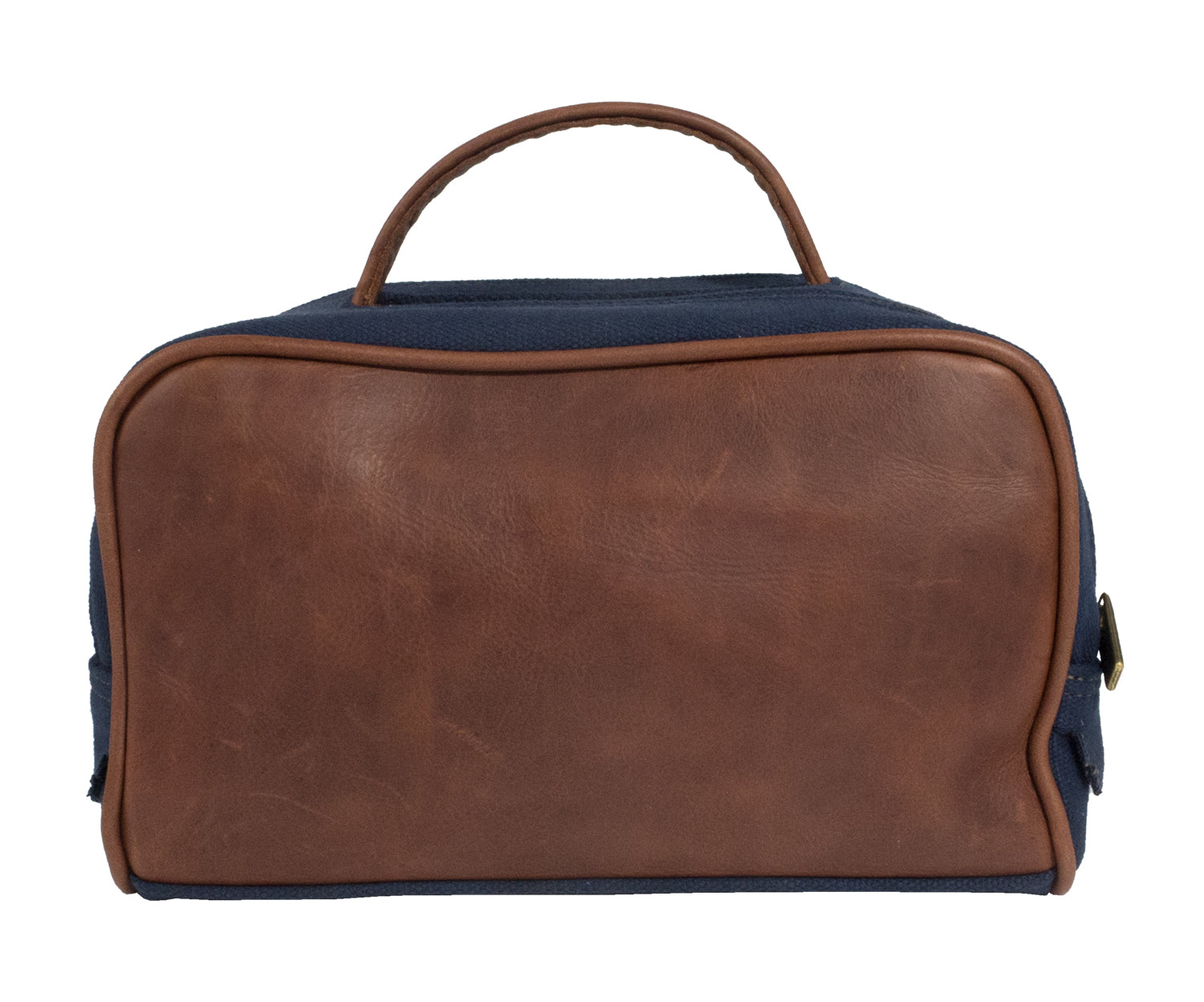 Get the ultimate traveler's essential with our stylish and functional toiletry case. Made expertly from top-grain leather, it boasts an authentic feel that guarantees durability. With the addition of rugged blue canvas, our bag is sturdier than ever while still being aesthetically pleasing.