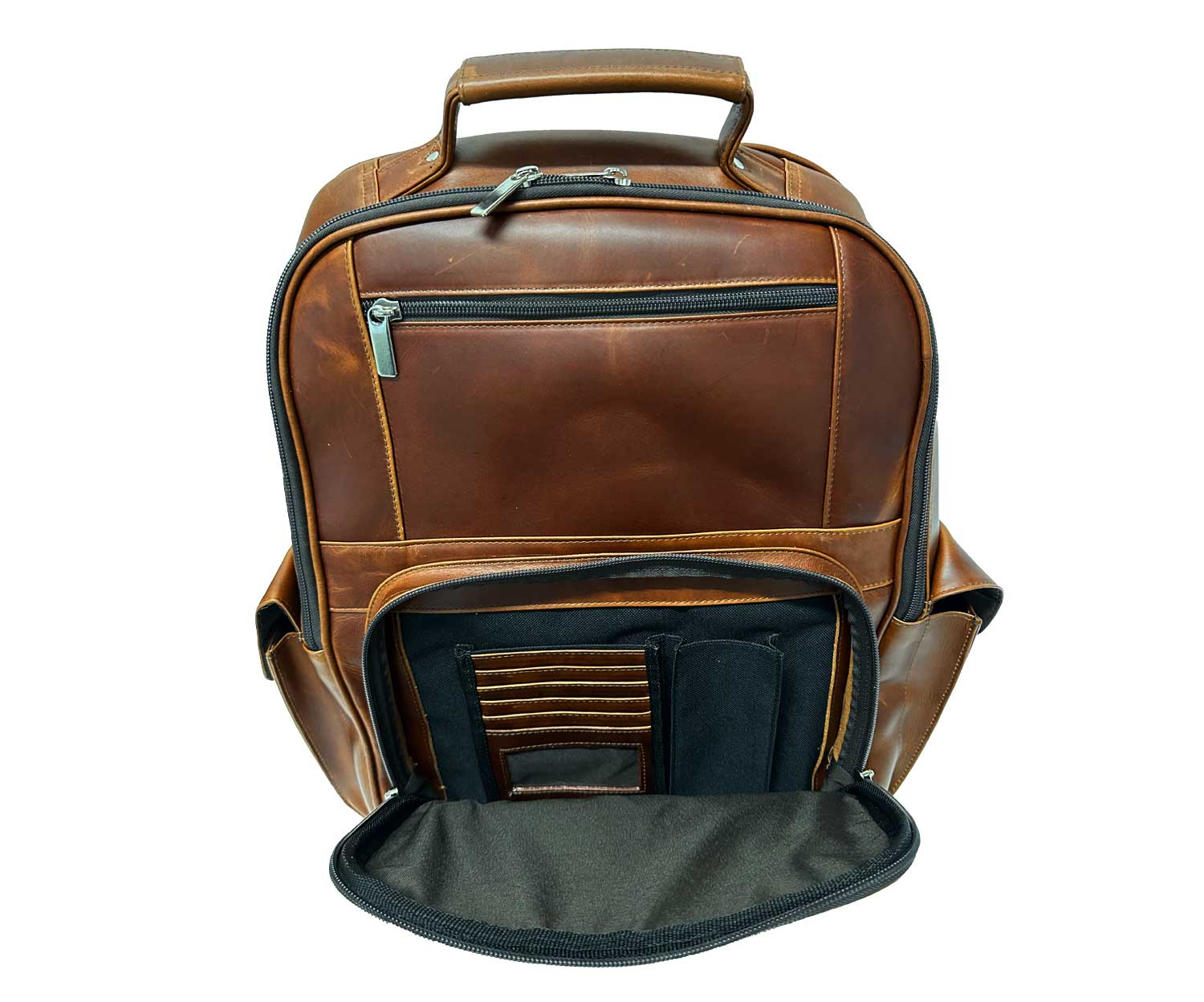You will also find that there is plenty of room for other items in the compartment, and the front zipper offers additional storage options, complete with slots for business cards. That way, you can keep all your important documents organized and easily accessible. To provide even more space, there are two velcro closure pockets on the front of the backpack, allowing you to store items that you need to access quickly. You will also find that the backpack is fully lined, making it comfortable to wear when it's loaded up. So, it is the perfect combination of functionality and style.