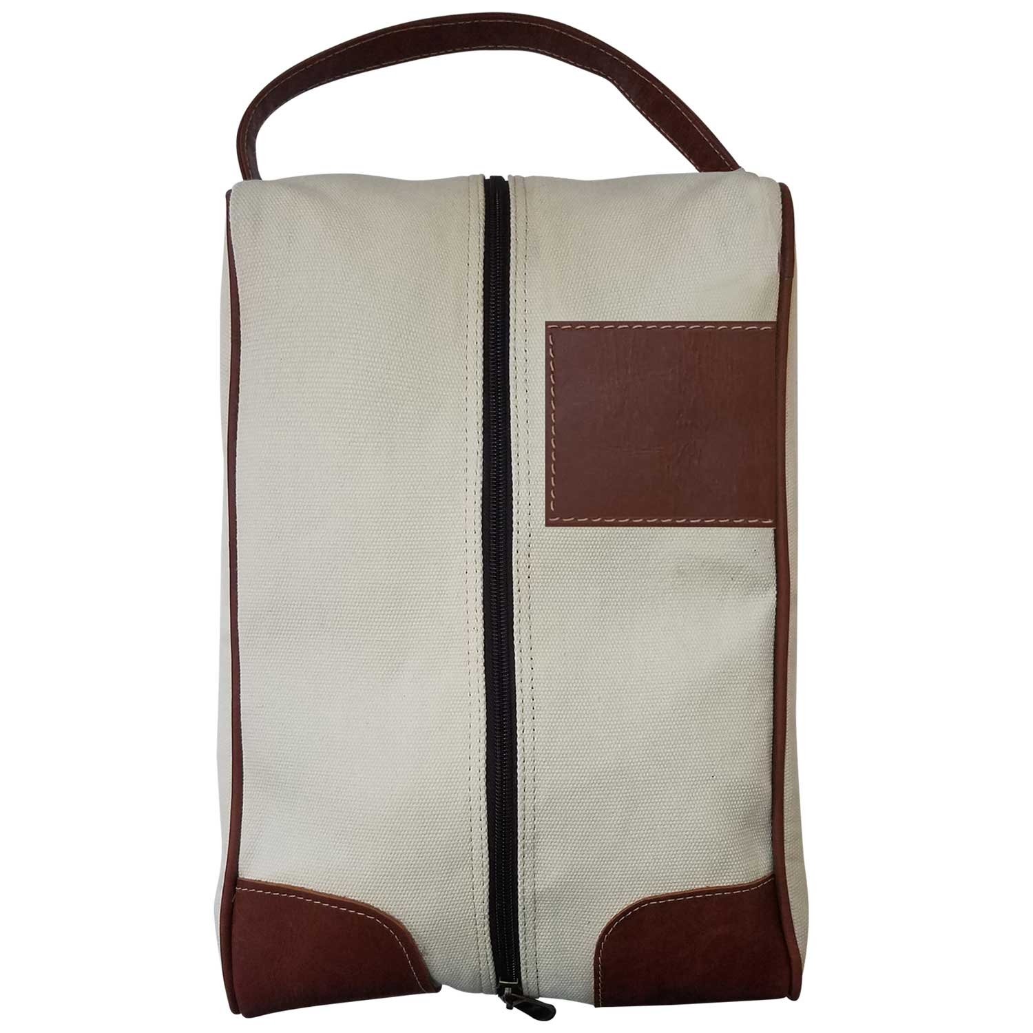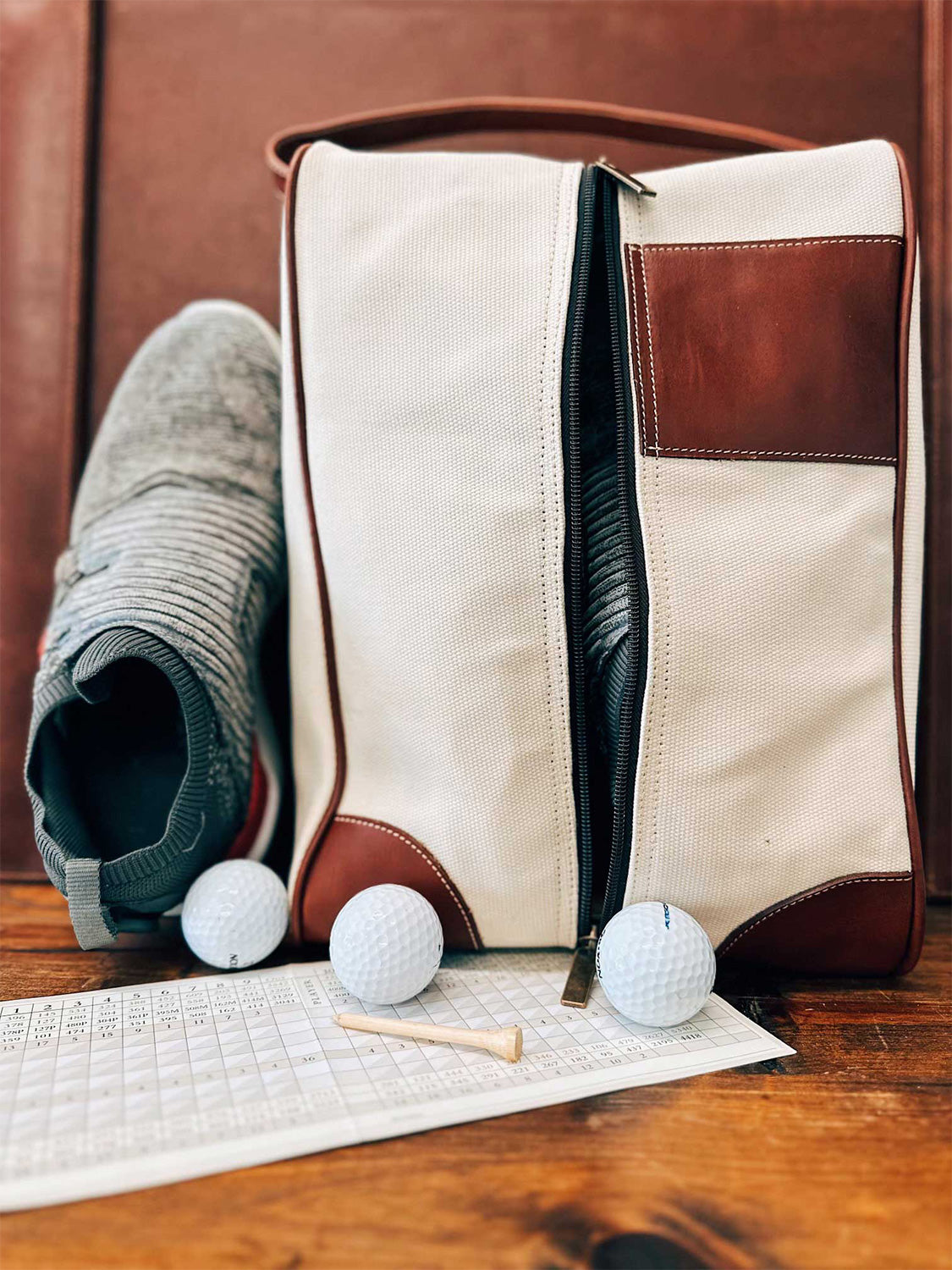 Introducing a stylish leather shoe bag with a durable canvas exterior. The center zipper provides easy access, while the interior pocket separates shoes and doubles as a storage for valuables. The bag is luxurious and fully lined for protection. Perfect for any golf course journey or activity, experience luxury and organization.